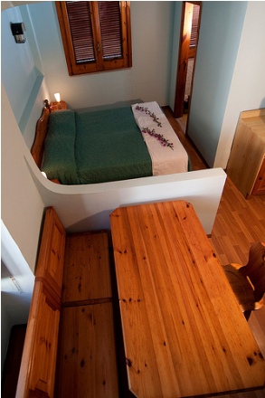 - Residence C, 30 sq. m, sleeps 3 , composed of sitting- dining room with kitchen corner and single sofa bed, double bedroom on the same floor or raised floor, bathroom, and terrace or independent garden.