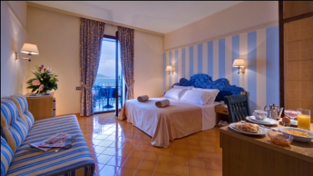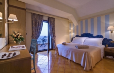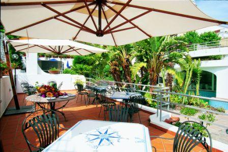 L'Hotel sorge in posizione panoramica di fronte la sabbiosa spiaggia della Mandra a Ischia con splendida vista del Castello Aragonese - Offre diversi servizi di buona qualità come l'attrezzato Centro Termale interno ed una buona cucina, in più la spiaggia privata per gli ospiti - Ideale per una vacanza d'elite tra relax e benessere.