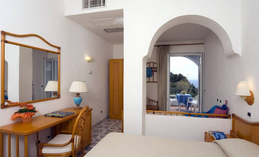 Camere:Le 80 camere dell' Hotel Parco Villa Teresa con vista sull'incantevole Baia di Citara, e sul verdeggiante Monte Epomeo sono eleganti ma allo stesso tempo sobrie, accessoriate per offrire il massimo del confort. In più il nuovissimo complesso Superior dotato di camere con TV satellitare, Aria condizionata, ricavate in uno splendido angolo di macchia mediterranea.