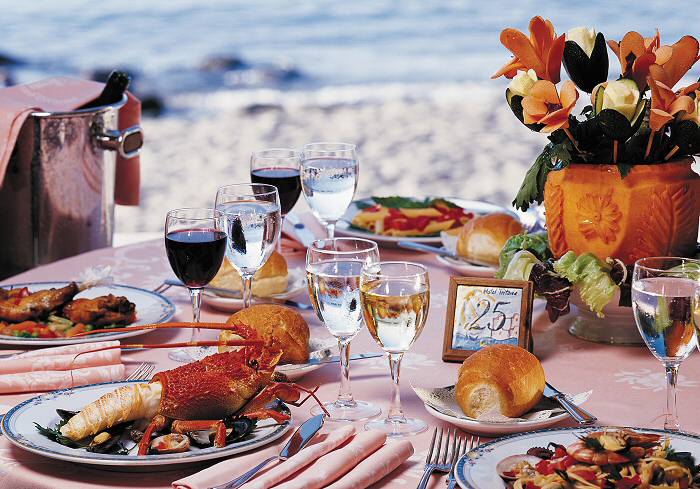 A Tavola: Potrete scegliere di apprezzare il lavoro del nostro chef nel ristorante in terrazza o in quelli interni, di assaporare la cucina nazionale ed internazionale; ma ci permettiamo di consigliarvi la nostra cucina tipica, non solo per i benefici effetti della dieta mediterranea, ma perchè in essa i sapori vengono esaltati nella semplicità e nella leggerezza. Basterà un assaggio perchè vi conquistino.